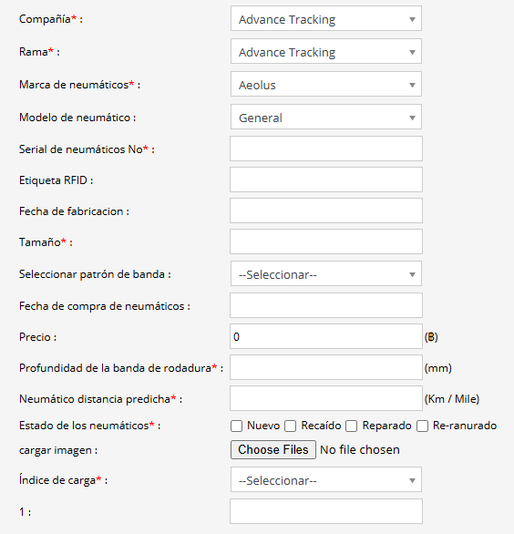 - Seleccione el Modelo del Neumático en la lista desplegable o agregue un nuevo modelo.