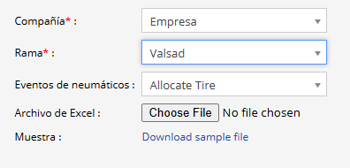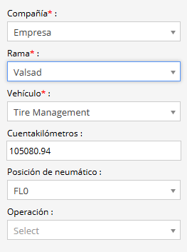 - Seleccione la Empresa, Sucursal y Vehículo correspondientes en la lista desplegable para los cuales desea realizar la operación de neumáticos.