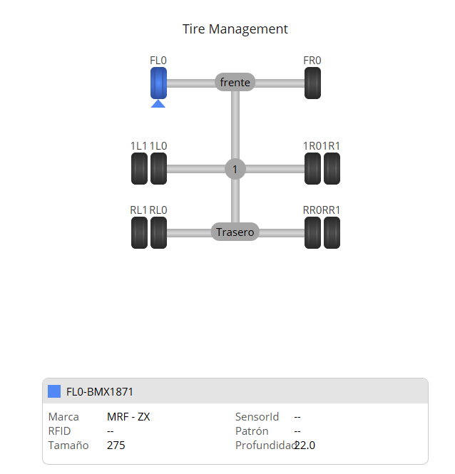 - La posición del neumático seleccionada se mostrará en el diagrama del eje junto con los detalles del neumático en la pantalla, como se indica en la imagen a continuación.