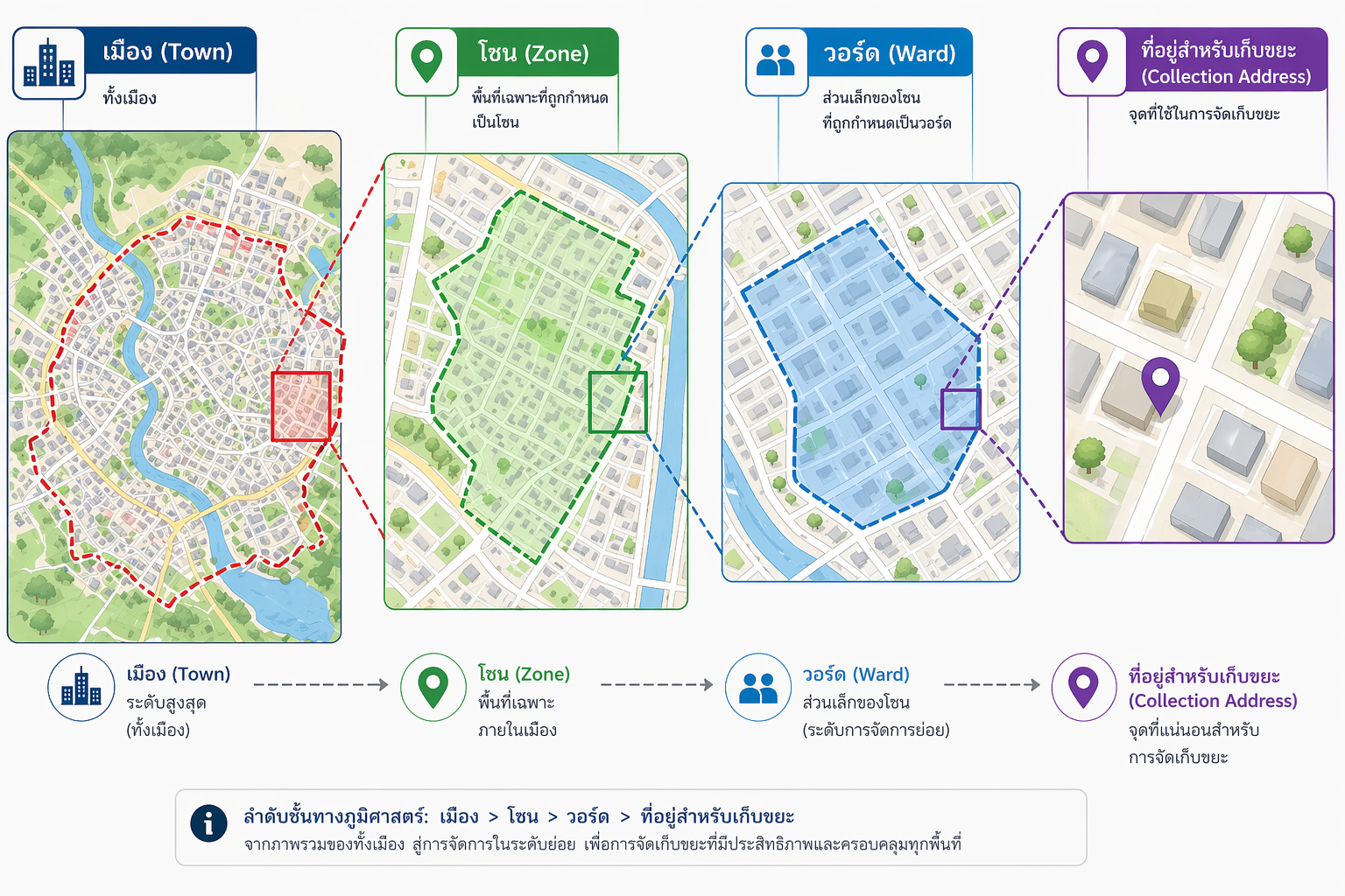 การกำหนดขอบเขตในระดับวอร์ดช่วยเพิ่มประสิทธิภาพในการวางแผนเส้นทางการเก็บขยะ การจัดสรรกำลังคน และการจัดตารางยานพาหนะ ส่งผลให้การให้บริการครอบคลุมและมีความรับผิดชอบมากยิ่งขึ้น