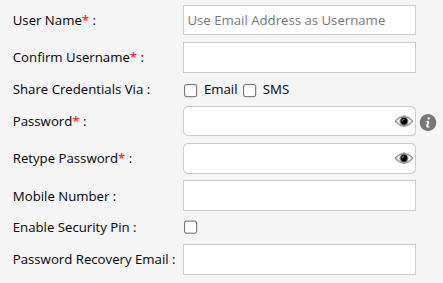 - Share Credentials Via, click on the checkbox to share the Login credentials .