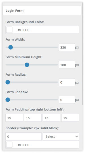 - Use the slider to adjust the Form Width, Form Minimum Height, Form Radius, and Form Shadow in pixels.