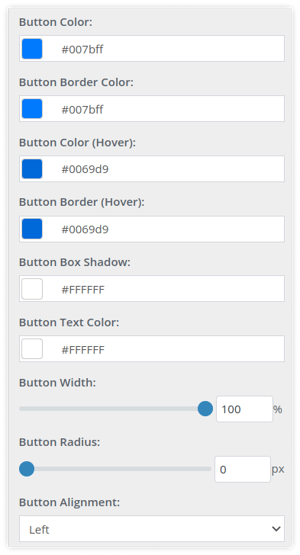 - Use the color picker to set the Button Color, Button Border Color, Button Hover Color, Button Border Hover Color, Button Box Shadow, and Button Text Color.
