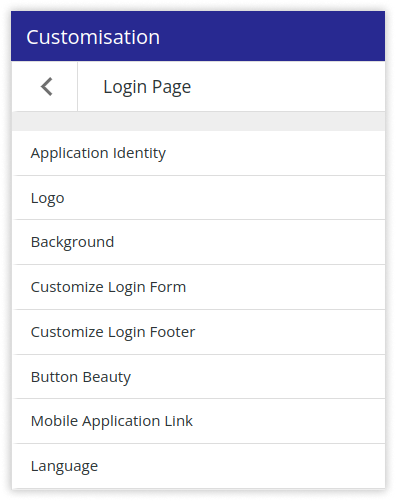In the customization of Login Page, user can modify the Application identity (Application name, domain name, page name), Logo, Background, Login Form, Login Footer, Button Beauty, Application Link, Language for Login page and the default language of the application.