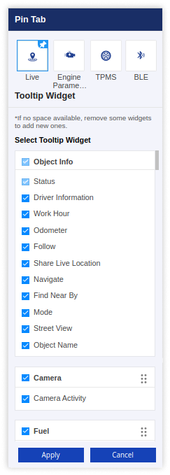 • Pin Tab: Users have the option to pin a specific tab for convenient access, ensuring it appears by default when they click on the object on the live tracking screen.