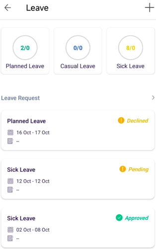 - In Leave Status you will find the status of the leave, if the leave is approved Declined or Pending.