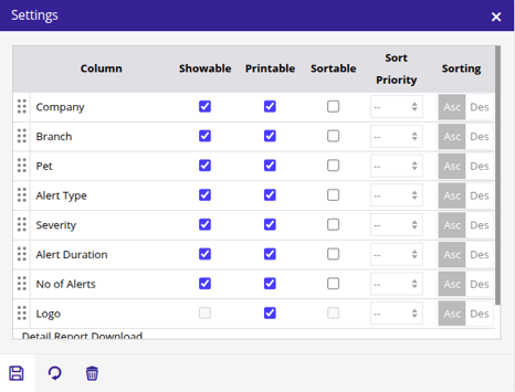 , the window as shown in the below-given image will open, from which the users can select if the columns should be showable, printable, or sortable, along with sorting priority and order. Click on the Save 💾 button to save the settings.