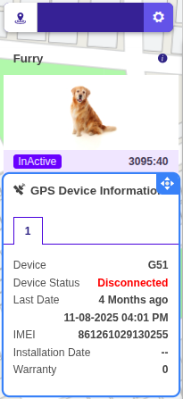 The Pet tab provides a comprehensive overview of all vehicle associated with the logged-in account, organized by their current status—such as Running, Stopped, Idle, and Inactive. This tab also presents essential details, including the object number, name, speed, driver information, the timestamp of the last data update, the status of connected ports, etc., all conveniently displayed in one location.