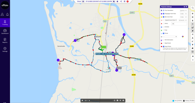 As it can be seen in the image below, features like alerts, inactivity, route, etc., can be checked or unchecked based on preferences. The selected data points will appear on the playback route.