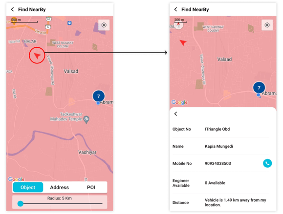 The user can find all the nearby vehicles, addresses or POIs within the selected radius.
