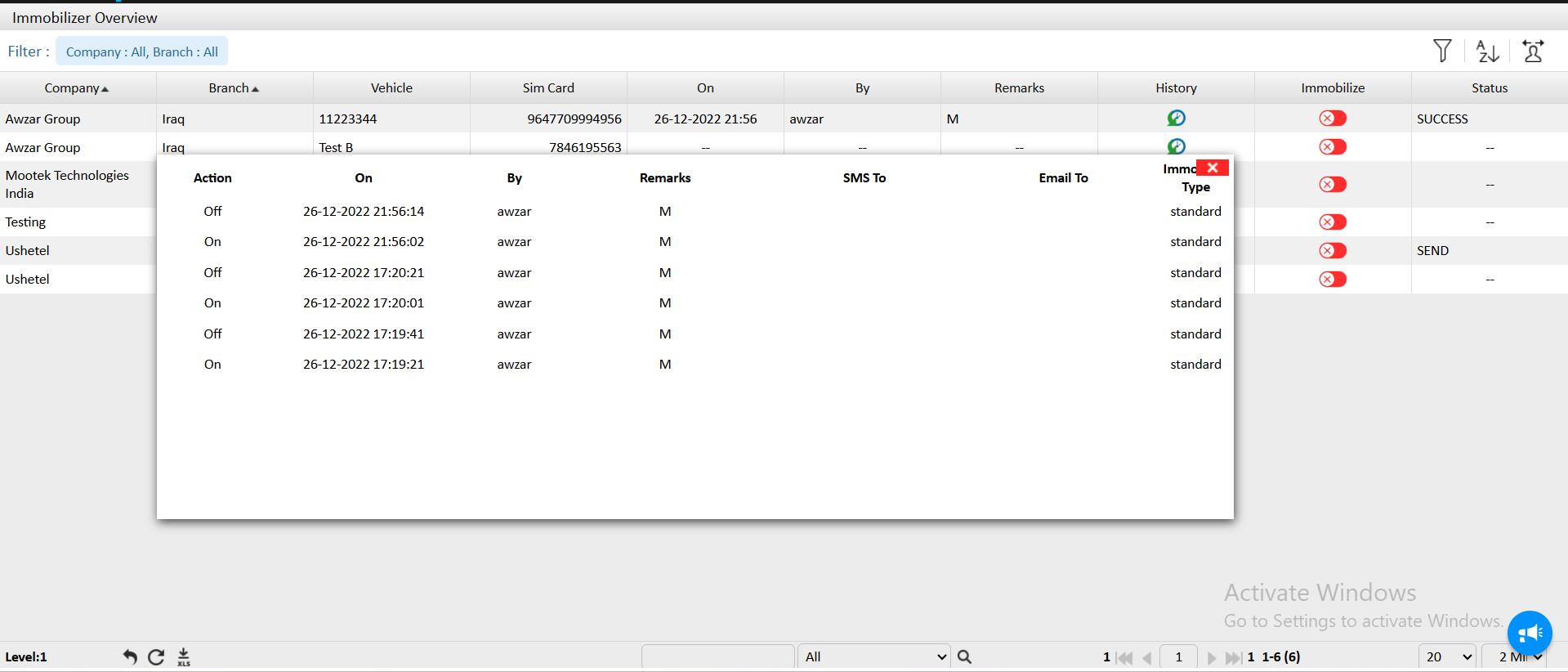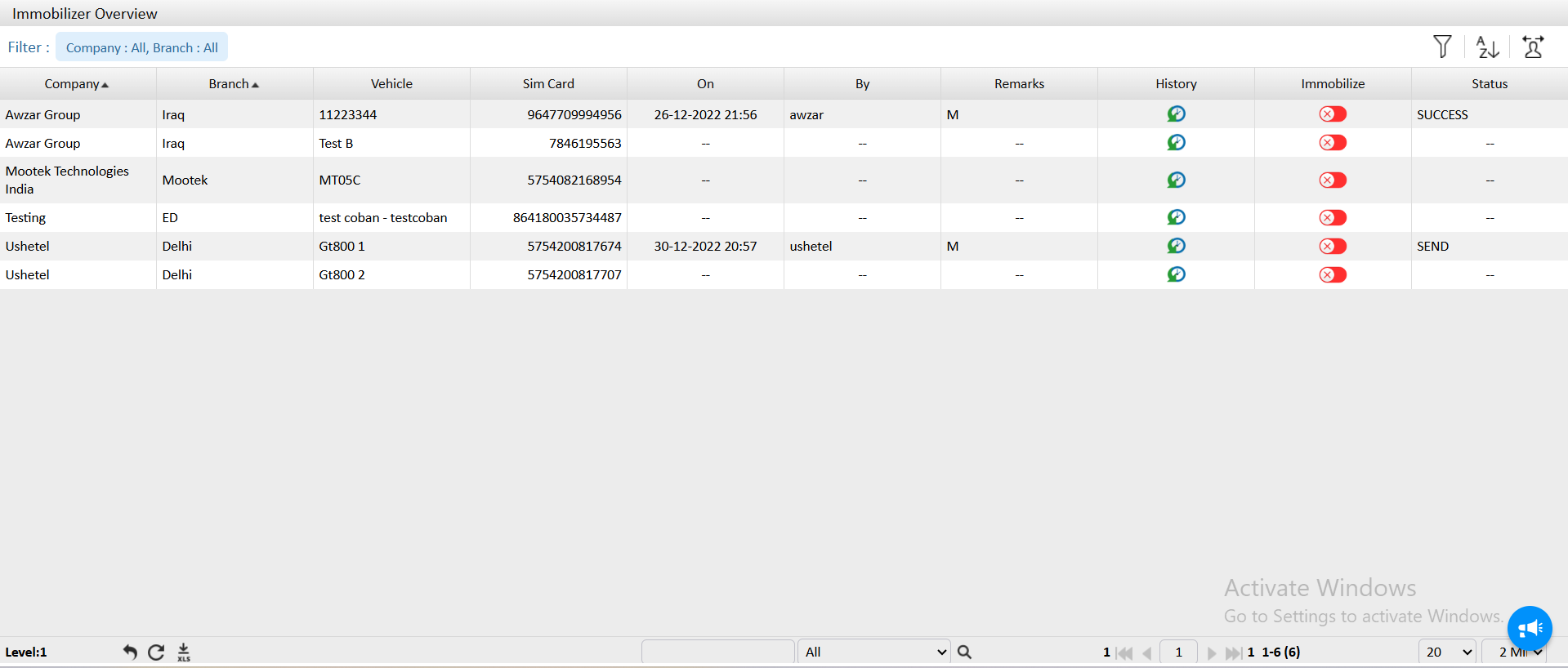 The Immobilizer Overview screen provides a centralized view of all vehicles for which immobilization actions can be managed and monitored. It allows authorized users to check immobilizer status, send immobilize commands, and review immobilization history across companies and branches.