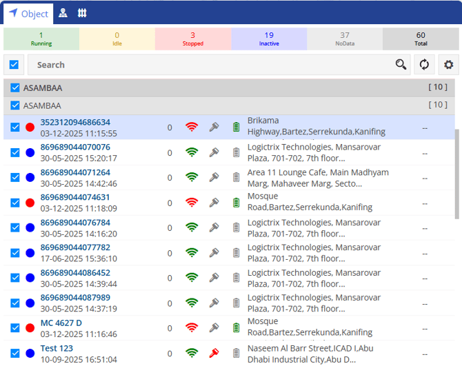 This tab shows objects categorized by their current status, such as Running, Stopped, Idle, Inactive, etc., along with key details like object number, name, speed, driver info, last data update time, connected port status, and more—all in one place.