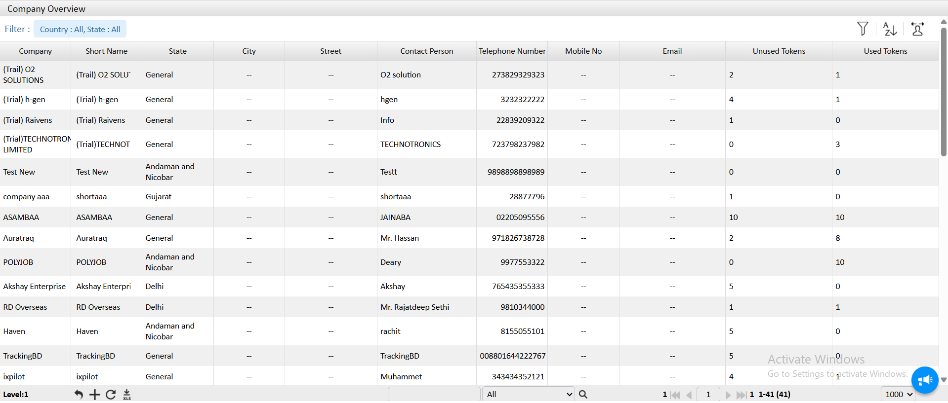 The Company Entity Overview screen provides a consolidated view of all company accounts created within the system. It helps administrators, superusers and reseller monitor details, token usage, and contact information in a structured tabular format.