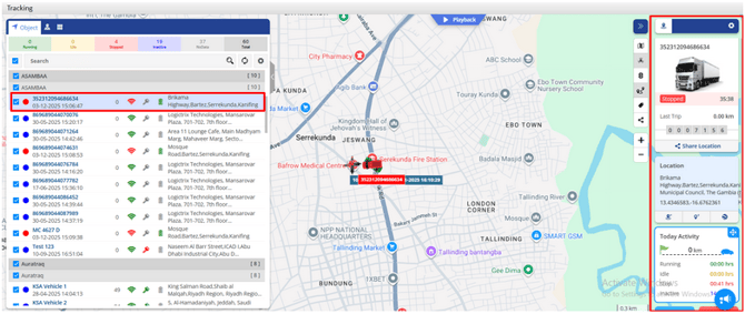 Information about the current or recent activities of the object can be viewed. It could display details such as the distance, running, idle, stop, inactive and last stop. The user can also view the logs of the data received from the device. - Speed: