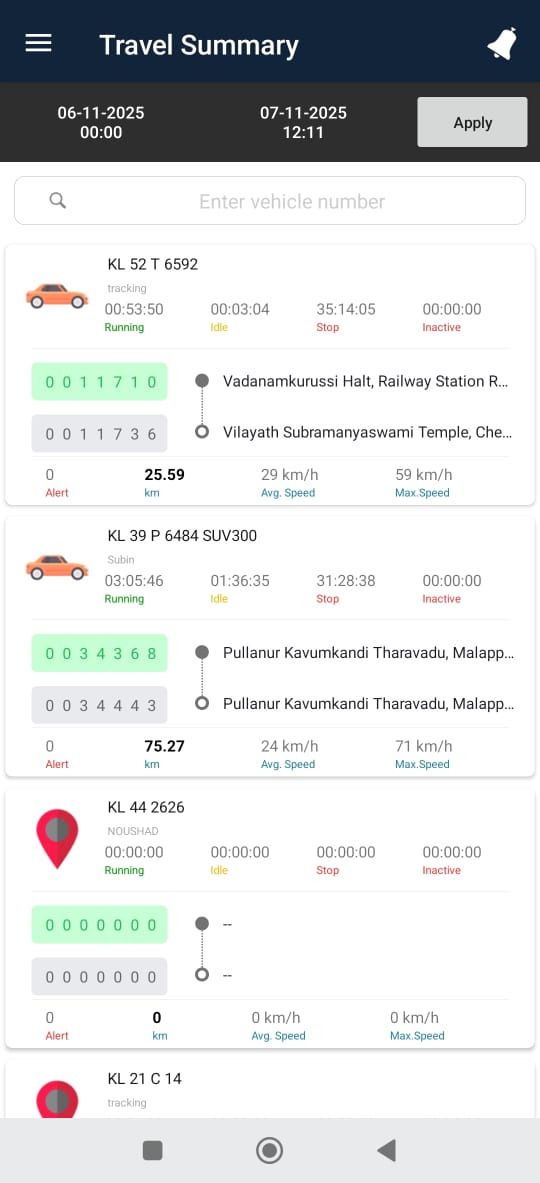 The Travel Summary screen provides a detailed overview of each vehicle’s travel performance over a selected period. It combines trip-level statistics such as distance covered, average and maximum speed, and time spent in different statuses — helping fleet managers quickly assess productivity, driving behavior, and operational efficiency.
