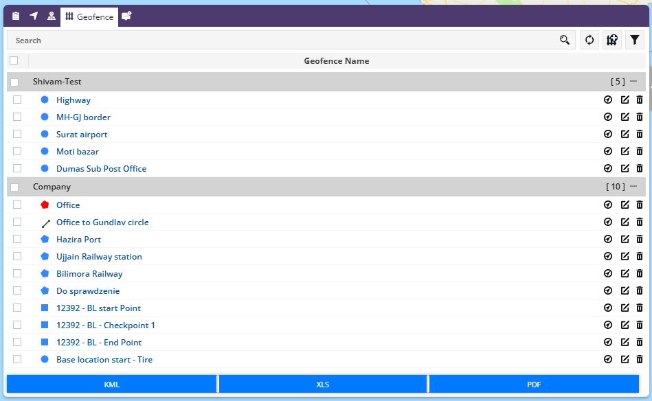 - Click on the XLS or PDF or KML button located at the bottom based on your preference to initiate the download of the geofence details.