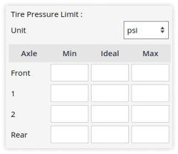 • Enter the Minimum, Ideal and Maximum pressure limits for the tires in each axle.