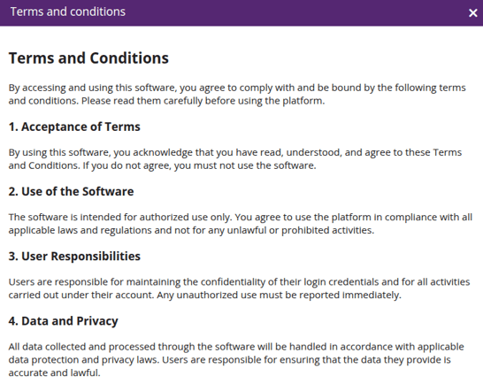 - Go to User icon > Terms and conditions.