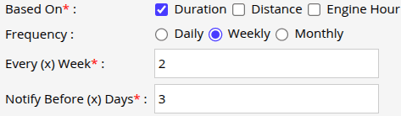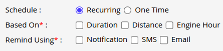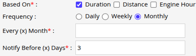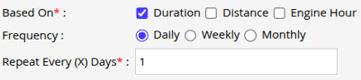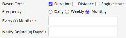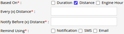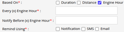 - From Based On, select how you want the reminder to be configured: Duration, Distance, or Engine Hour. You can select at least one option, or choose multiple options if required.