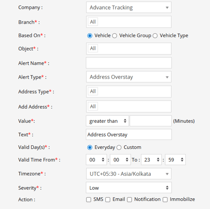 - Address: The system checks if an address is defined or not in order to trigger an Address OverStay alert.