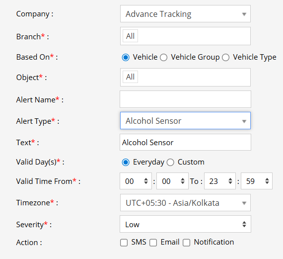 Alcohol Sensor Connected:The Alcohol sensor must be physically connected to the object’s GPS device and configured to the correct sensor while adding an object. The alert triggers if the connection is lost or disrupted.