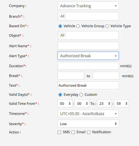 - Select the Alert Type as Authorized Break.