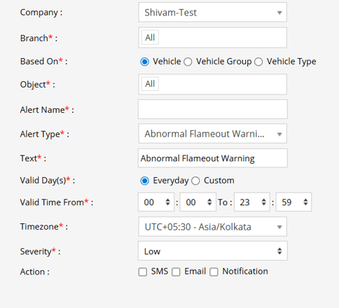 An Abnormal Flameout Warning (ADAS) alert is triggered when the ADAS system detects an unexpected engine shutdown while the vehicle is operating. Notifications are sent via SMS, Email, or In-App Notification, allowing fleet managers or operators to respond immediately, investigate the cause, and ensure vehicle safety and continuity of operations.