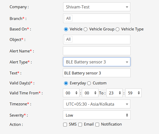 A BLE Battery Sensor 3 alert is triggered when the connected device’s battery approaches a low level. Notifications are sent via SMS, Email, or In-App Notification to fleet managers or operators, enabling timely maintenance or battery replacement to prevent sensor downtime and ensure continuous monitoring of vehicle or environmental parameters.