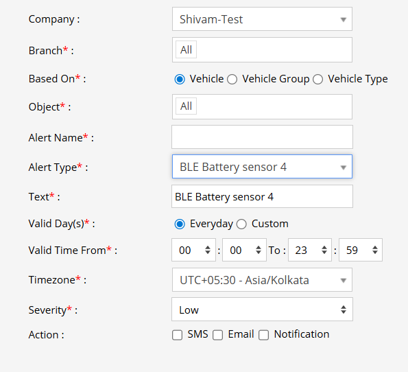 A BLE Battery Sensor 4 alert is triggered when the connected device’s battery approaches a low level. Notifications are sent via SMS, Email, or In-App Notification to fleet managers or operators, enabling timely maintenance or battery replacement to prevent sensor downtime and ensure continuous monitoring of vehicle or environmental parameters.