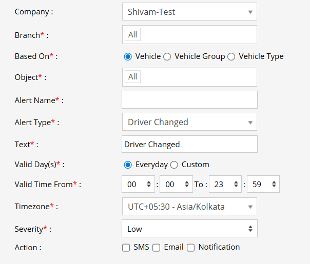 - Configure the Action to be taken when the alert triggers: SMS, Email, or Notification.
