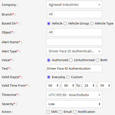 The Driver Face-ID Authentication alert is triggered when the ignition is turned ON and the system performs a facial recognition check. If the driver’s face matches the stored Face-ID record, an Authorized Driver alert is generated; if it does not match, an Unauthorized Driver alert is triggered. Notifications are sent based on the configured actions, enabling fleet managers to verify driver identity in real time and prevent unauthorized vehicle usage.