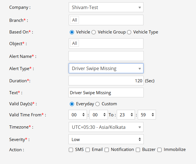 - Choose the Action to be taken when the alert is triggered: SMS, Email, Notification, Buzzer or Immobilize