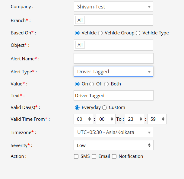 A Driver Tagged alert is triggered when a driver is tagged or untagged in a vehicle, based on the configured settings and vehicle status. Notifications are sent via SMS, Email, or In-App Notification, enabling fleet managers or operators to monitor driver assignments, ensure operational compliance, and respond promptly to driver activity changes.