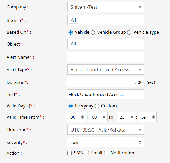 - From the Alert Type dropdown, select Elock Unauthorized Access.