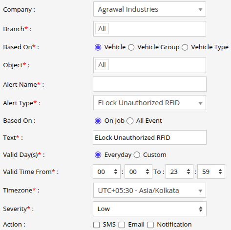 The E-Lock Unauthorized RFID alert is triggered when an unauthorized RFID tag is used to access or operate the electronic lock. Notifications are sent based on the configured actions (SMS, email, or in-app notification), enabling fleet managers to quickly identify and respond to potential security threats or unauthorized access attempts.