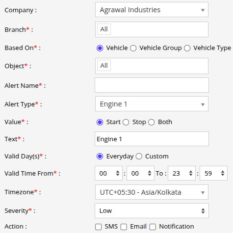 An Engine 1 alert is triggered when the vehicle’s engine starts, stops, or both (as per the configured setting). Once triggered, notifications are sent via SMS, Email, or In-App Notification, helping fleet managers track engine activity and ensure proper vehicle usage.