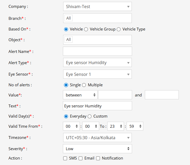 - Configure the Action to be taken when the alert is triggered:SMS, Email or Notification.