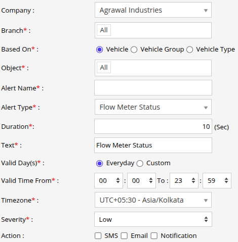The Flow Meter Status alert is triggered when the flow meter status changes or remains in a specific state for the configured duration. Once triggered, notifications are sent via SMS, Email, or In-App Notification, allowing fleet managers to take timely action and ensure proper monitoring of flow-related operations.