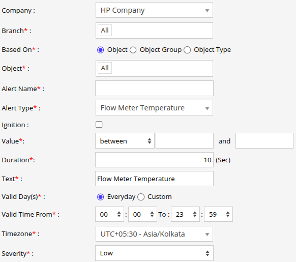Select the Alert Type as Flow Meter Temperature.
