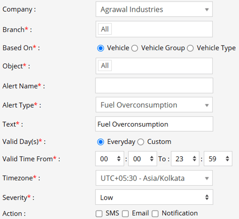 A Fuel Overconsumption Alert is triggered when fuel consumption exceeds the configured Distance based Fuel consumption & Duration based fuel consumption thresholds while a fuel sensor is connected. Notifications are sent via SMS, Email, or In-App Notification, enabling fleet managers to respond immediately, investigate excessive fuel usage, and take corrective measures to prevent fuel wastage, theft, or inefficient driving behavior.