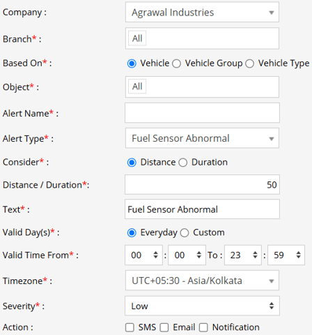 Select the Alert Type as Fuel Sensor Abnormal.