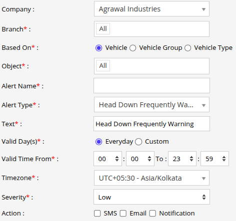 A Head Down Frequently Warning alert is triggered when a driver repeatedly lowers their head while driving, which may indicate fatigue or distraction. Once triggered, notifications are sent based on the configured actions (SMS, Email, or In-App Notification), helping fleet managers take timely action and encourage safer driving behavior.