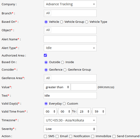 - Immobilize: To trigger the immobilizer when the alert is generated, enable the checkbox & select weather the immobilizer should be turned on or off.