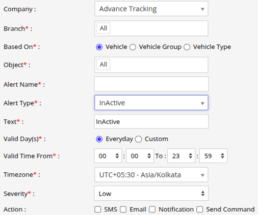 - Live Device: The Inactive alert works only for devices that are already connected to the server, i.e., vehicles with a status of Running, Idle, or Stop.