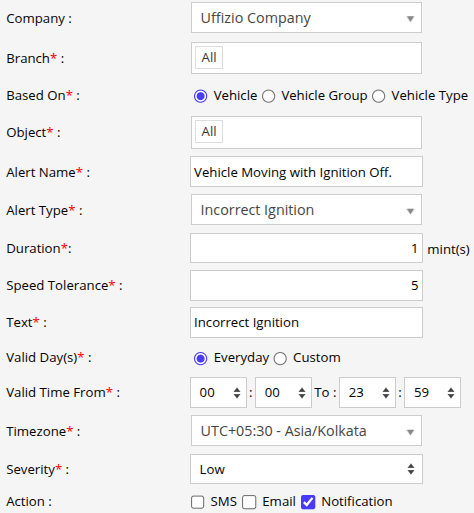 If a vehicle is detected moving above the defined speed limit (e.g., 5 km/h) for the configured duration (e.g., 1 minutes) while the ignition remains Off, the Incorrect Ignition alert is triggered. An SMS, Email, or In-App Notification is sent to the fleet manager or designated personnel, indicating possible ignition tampering, towing, or sensor malfunction.