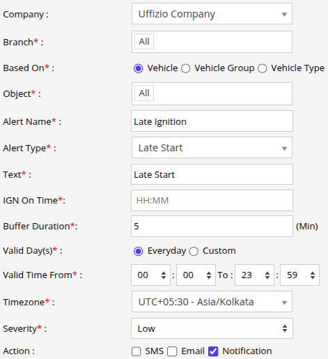If the vehicle’s ignition is not turned ON within this time (considering the buffer duration), the alert is triggered. - Buffer Duration (Min), Grace period (in minutes) allowed after the IGN On Time before triggering the alert.