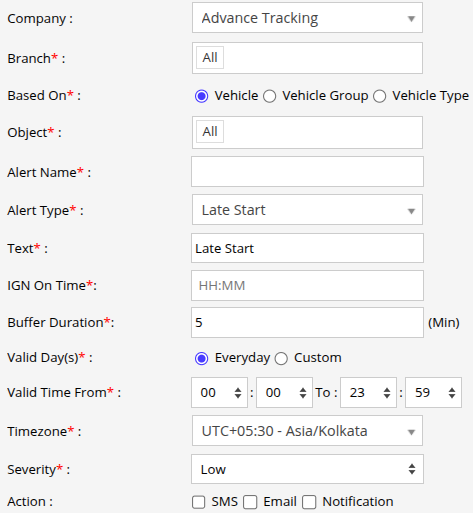 Late Start Alert is triggered when a vehicle does not turn on its ignition at the scheduled time, considering the defined buffer window. It is an event-specific alert. This alert helps fleet managers ensure timely vehicle starts, monitor driver punctuality, and maintain operational schedules effectively.