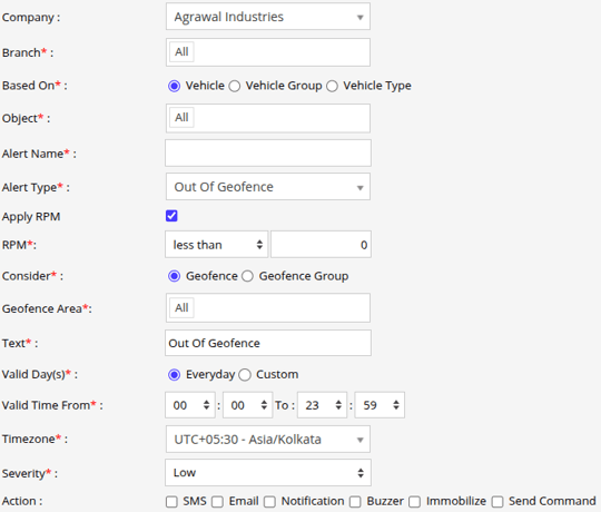 Select the Alert Type as Out of Geofence.