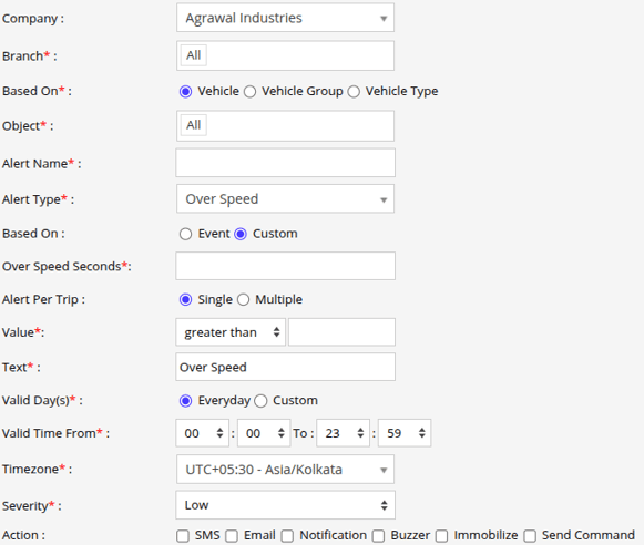 - Select Custom, If you want the alert to be triggered based on the custom configuration. ( Over Speed seconds & Value option will appear when you select custom )