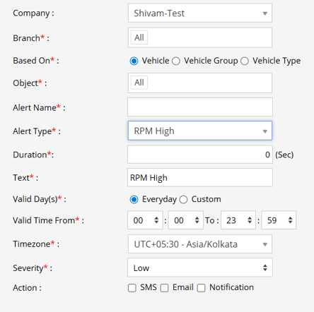 An RPM High alert is triggered when a vehicle’s engine RPM exceeds the configured threshold for the defined duration. Notifications are sent via SMS, Email, or In-App Notification, enabling fleet managers to monitor aggressive driving behavior, prevent engine strain, and promote safer and more fuel-efficient driving practices.